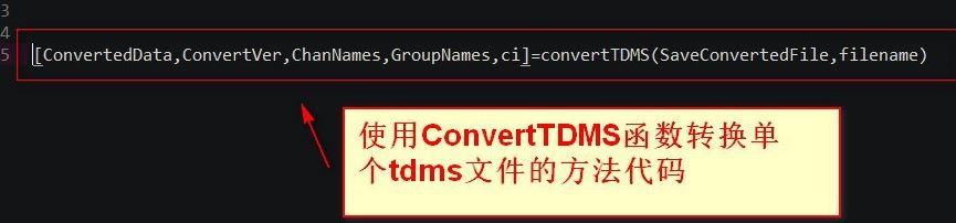 3、使用ConvertTDMS函数转换单个tdms文件的方法代码,如图: