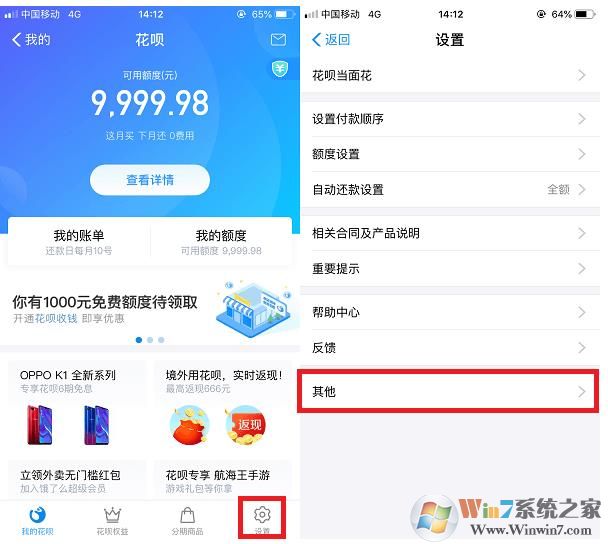 2、在花呗界面,我们选择底部栏最右侧的“设置”,然后选择“其他”。