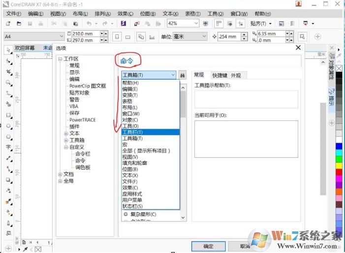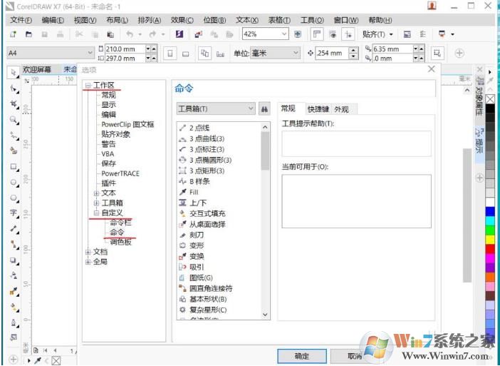 3、然后展开工作区——自定义——命令,进入设置界面,如下图;