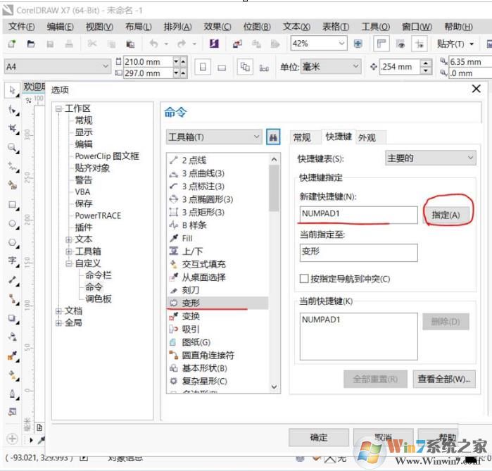 5、这里以变形工具为例,在快捷键编辑框输入数字键盘上的1(数字键盘1),点击指定;
