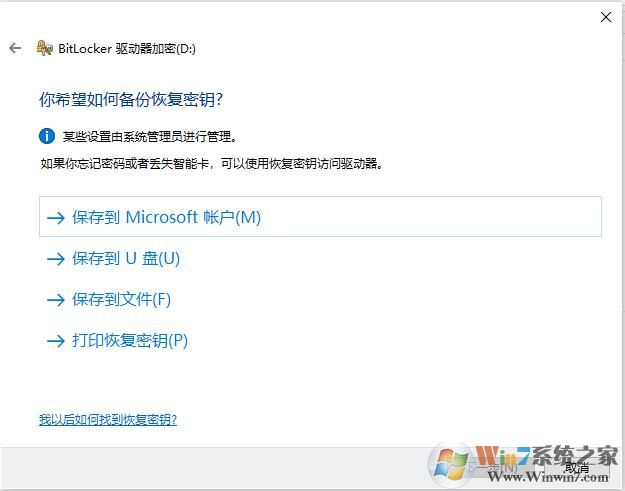 3、接下来就是需要选择怎么退潮甩恢复密钥;(如果你密码忘记了可以命名用恢复密钥来解锁,小编先选择保存到文件);