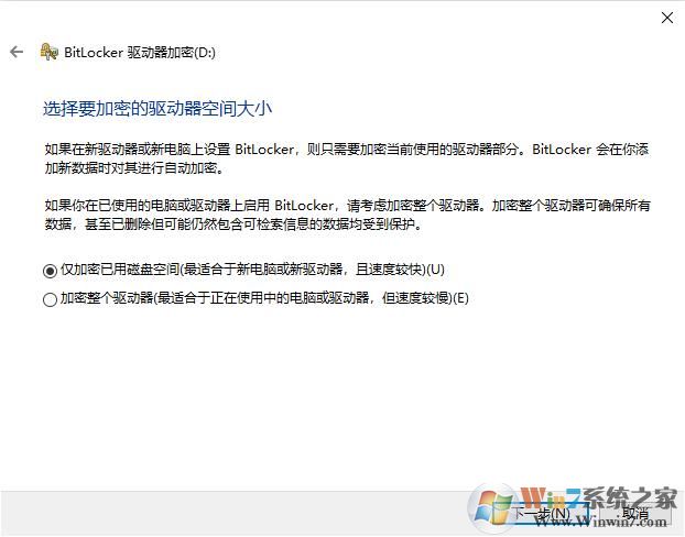 5、选择要加密的空间大小,可选择仅加密已经使用的磁盘空间,或是加密整个驱动器;(选择仅加密已用的磁盘空间是推荐的,加密会比较快,之后新加入的文件会自动加密)