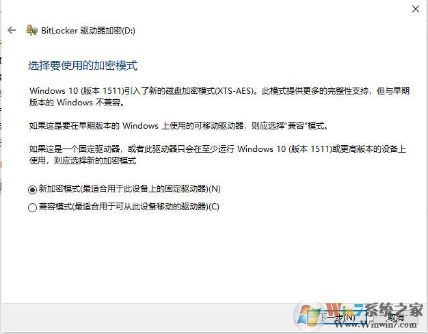 6、选择加密的模式,有新加密模式和兼容模式,可移动的驱动器建议兼容模式,本机的话就新加密模式;