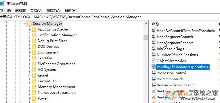 HKEY_LOCAL_MACHINE\SYSTEM\CurrentControlSet\Control\Session Manager,然后在右侧框中找到PendingFileRenameOperations