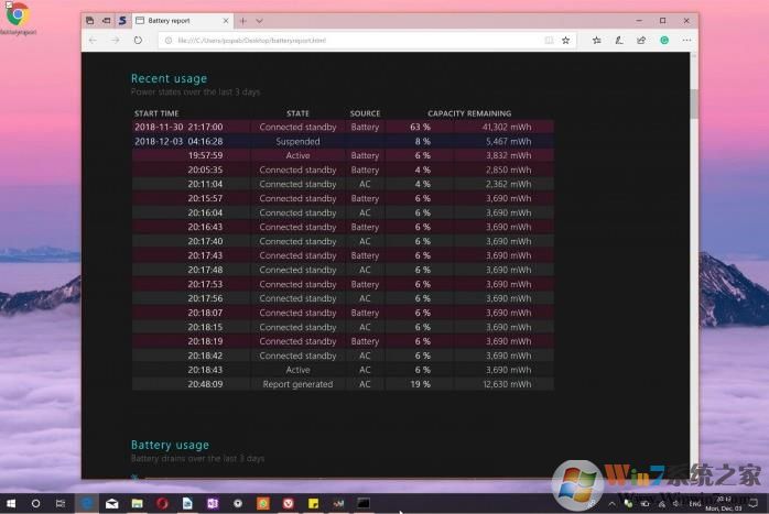 在生成报告之后,用户可以通过双击这个.html文件来查看信息。在页面上包含了大量关于电池的信息,包括电池名称、制造厂商、序列号、化学成分、设计容量,完全充电容量和循环计数等等。此报告还提供对使用历史记录日志的访问,该日志显示AC和电池上系统使用的历史记录,以及显示系统电池充电容量历史记录的电池容量历史记录日志。最后但同样重要的是,Windows 10还会根据观察到的电量生成电池寿命估算值。