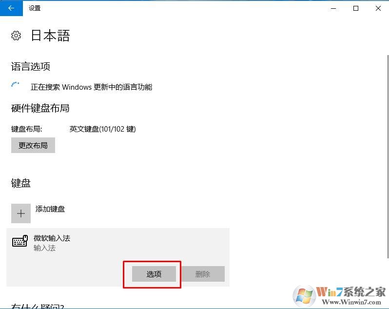 5、稍等一会就可以添加完成,回到区域和语言选项,点击日本语,然后再点选项;如下图