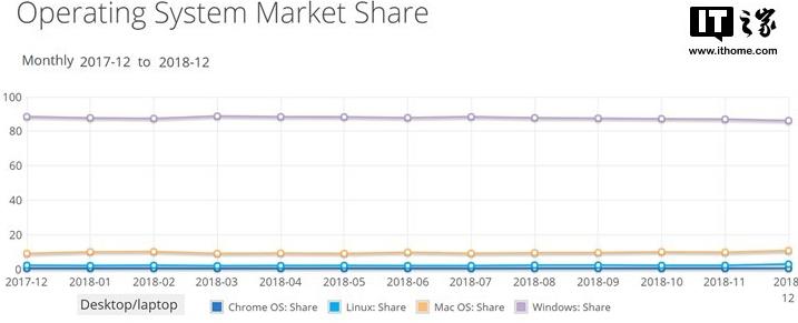 2、不过从桌面系统整体市场看,Windows桌面操作系统份额有所下滑,现在占据市场份额的86.12%,而MacOS市场份额为10.65%,其他依次是Linux 2.78%、ChromeOS 0.32%。竞争对手ChromeOS在2018年没有取得任何重大进展。