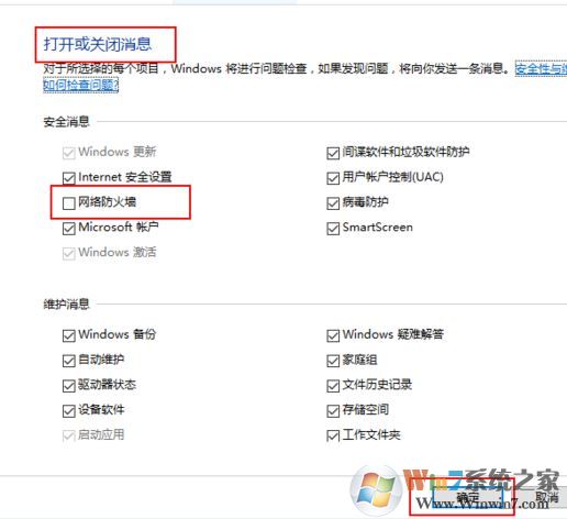 4、最后点击关闭有关“网络防火墙”的消息,也就是在小方框里打勾,点击确定保存设置即可!