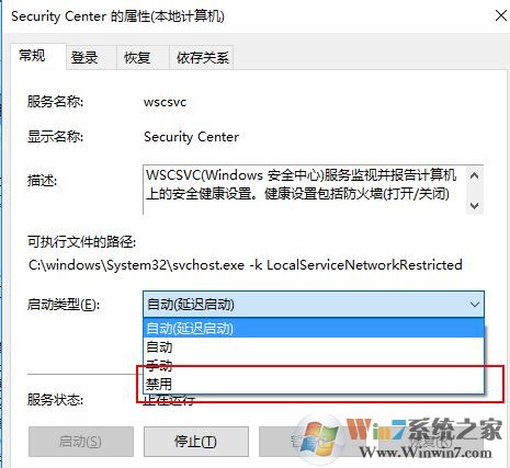 3、打开Security Center属性界面后,将【启动界面】点选【禁用】;