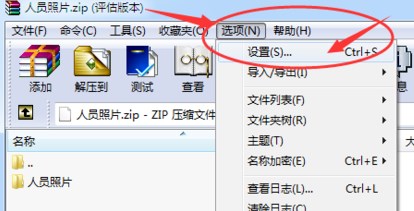 2、在WINRAR软件中,找到菜单栏中的【选项】,然后选择第一个【设置】,如图: