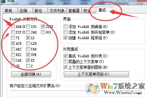 3、在【选项设置】界面,我们选择最后一个选项卡【集成】,在这个选项卡中,我们可以看到下面左侧第一个【WINRAR关联文件】,这里ZIP格式前的方框是空着的,我们在前面打上对勾。然后点击下方的【确定】按钮,如图: