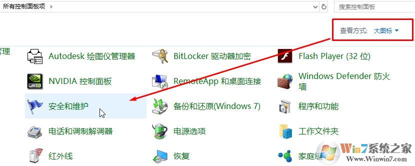 2、在控制面板将查看方式改成 大图标,点击 安全和维护,如图: