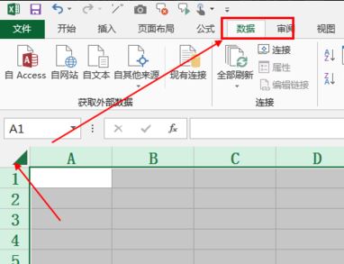 1、打开excel,选择单元格,点击“数据”功能,如图: