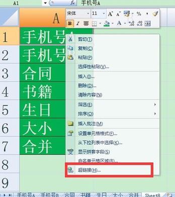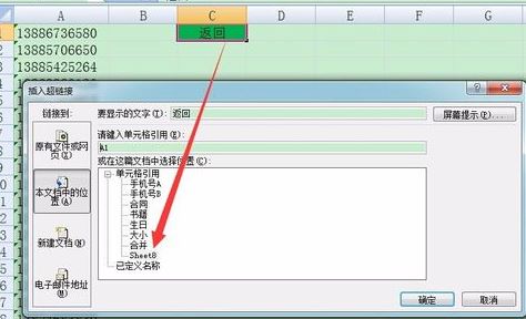 5、我们按照刚才的方法,在“手机号A”这个Sheet里设置一下返回到汇总表sheet8的超链接,如图: