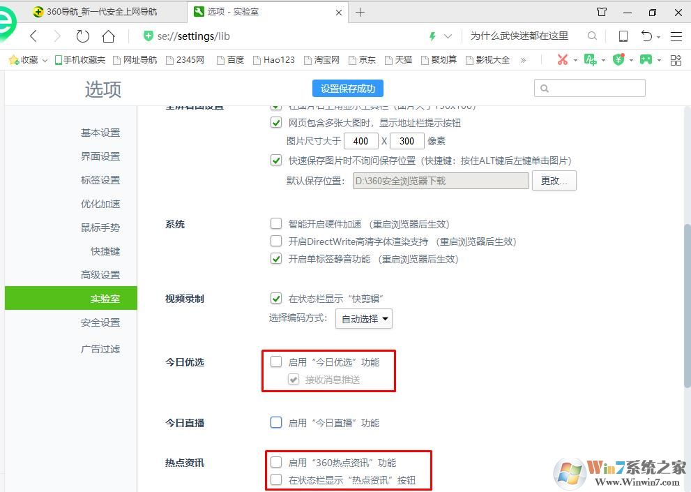 2、然后在实验室中,取消勾选,今日优选、热点资讯等几项。