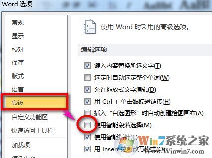 2、在选项卡设置里边,找到【高级】——取消对“【使用智能段落范围选择】”复选框的勾选,然后单击【确定】按钮,目的是为了修复文件;