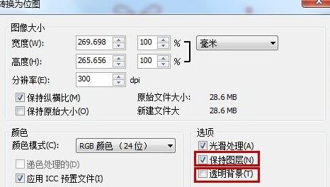 6.勾选“保持图层”或“透明背景”,“确定”。这里的图像大小可以不管,100%就行。