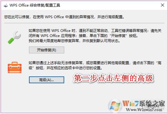 2、然后会出现以下WPS Office综合修复/配置工具窗口,点击下方的高级按钮;