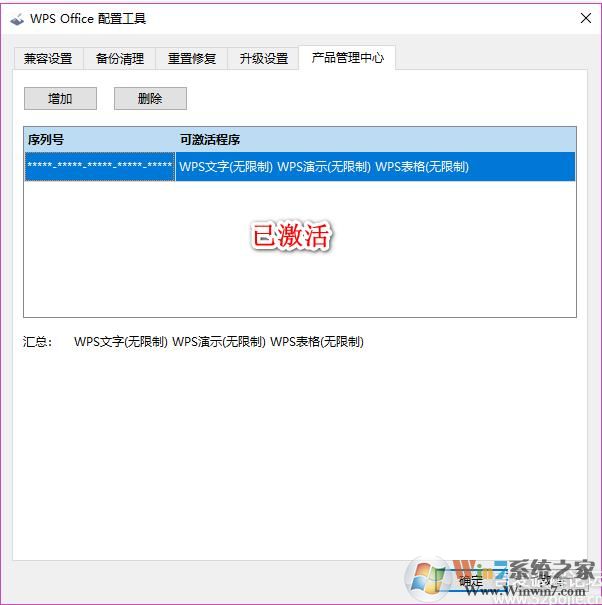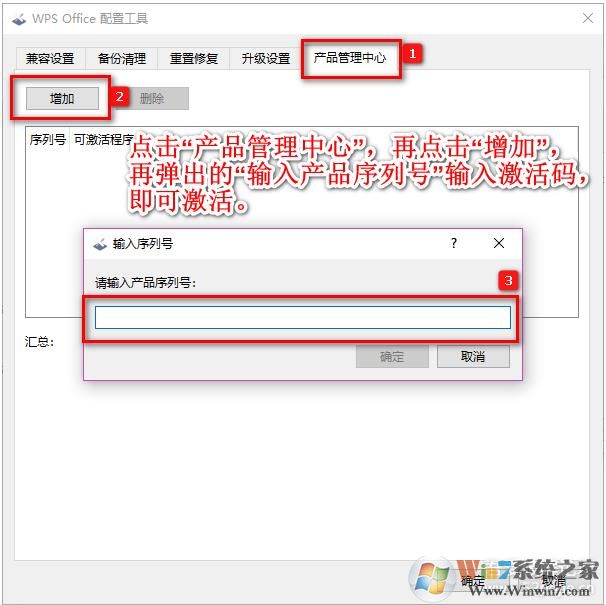 3、这时会出现配置工具,我们就点击,产品管理中心,再点击增加,出现输入框,把你的产品密钥输入进去;