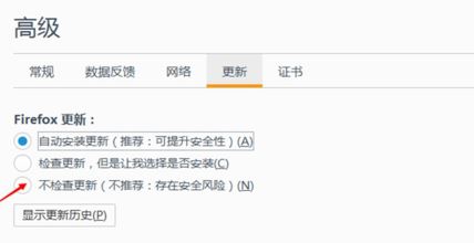 7.这时候,会有三个选项,三个选项分别是自动更新,检查更新和不检查更新,就是这个三个选项来控制我们的火狐浏览器是否自动更新的,其中最后一个就是不让火狐浏览器检查更新。