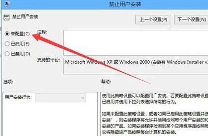 7、我们把该项设置为未配置或是已禁用,然后点击确定按钮保存退出,这样以后就可以正常安装程序了,如图: