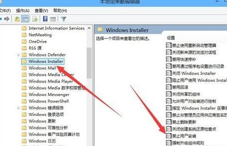 5、在打开的Windows组件菜单项中找到Windows Installer菜单项,在右侧找到禁止用户安装一项;