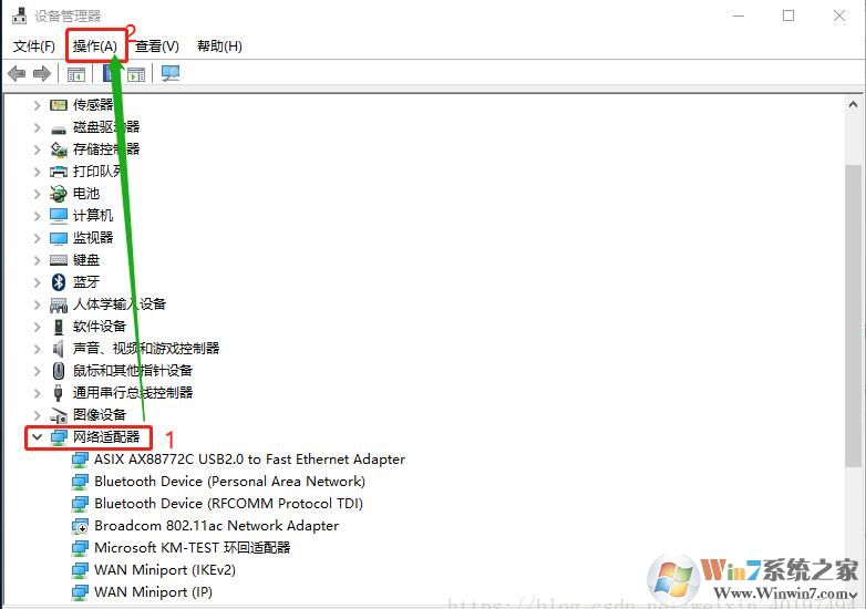 2.然后展开网络适配器,先看下网卡驱动是否正常,如果没有网卡或是出现感叹号,可以右键键更新下网卡驱动,如果一切正常,选中网络适配器-操作–添加过时硬件(一定之后的话很重要,不然直接选择操作找不到)