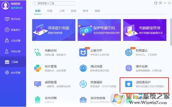2、点开工具箱按钮后,我们找到【浏览器保护】这一个功能。