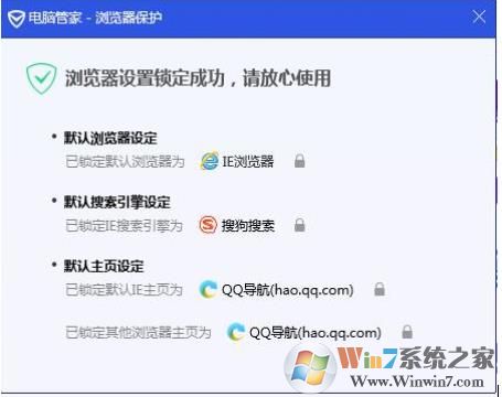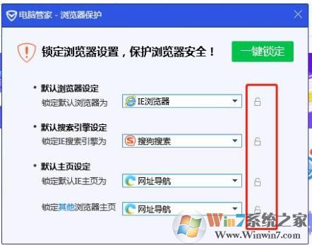 4、点击右侧的向下的箭头可以选择相应的设置,右边的锁都会锁的状态时就锁定完成了。QQ电脑管家可以锁定的项目有:默认浏览器、IE默认搜索引擎、IE主页、其它浏览器主页