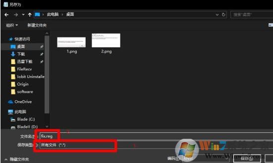 3.保存文件,选择所有格式,文件名后缀必须要是【reg】。