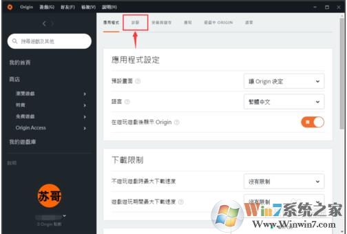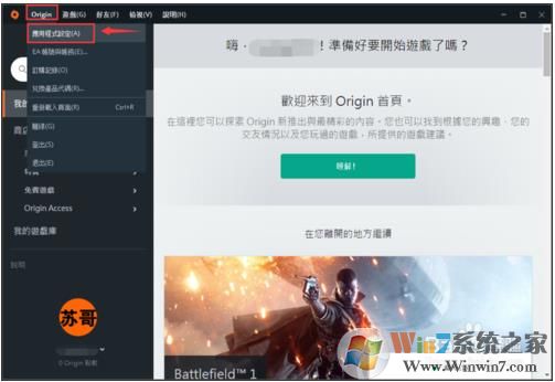 1、首先打开origin平台并登录,然后点击左上角的"origin"按钮,选择"应用程序设定",