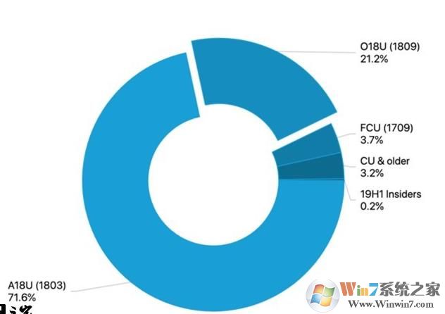 从上面的图标可以看出,目前用户使用数最多的还是18年四月更新也就是Win10 1803的版本,市场占有率为71.6%,而1809也就是十月更新版本的市场占有率为21.2%,此外更老旧的Windows 10版本占有率大约为6.9%,同时也有0.2%的消费者已经使用19H1的开发者版本。