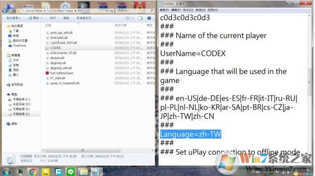 3、bin资料夹里面有个CODEX.ini文件,打开找字串 Language=en-US