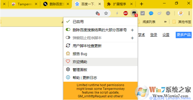 安装后就可以继续用来安装各种第三方开发者们提供的定制脚本,如本文要使用的屏蔽百家号搜索结果脚本。