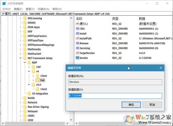 3、要进一步了解.NET Framework的版本详细信息,点击下一级分支中Client或Full子项下的Version字符串值,在“数值数据”中即可看到详细信息;