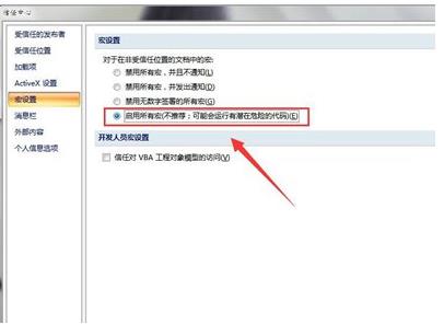2.在打开的信任中心窗口中,点击选择宏设置为“启用所有宏(不推荐:可能会运行有潜在危险的代码)”,点击确定按钮完成操作。如下图所示