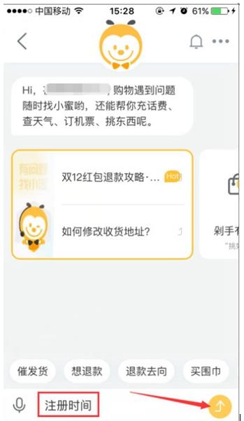 3、在打字栏里输入“注册时间”或者淘龄,点击发送按钮;