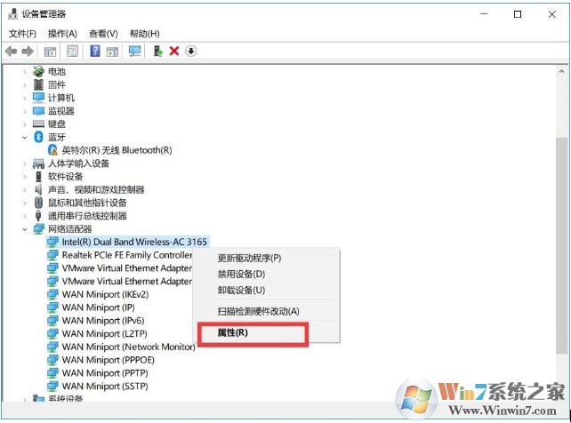 5、点开网络适配器,右键点击你的无线网卡,属性(无线网卡一般会有wireless名称)