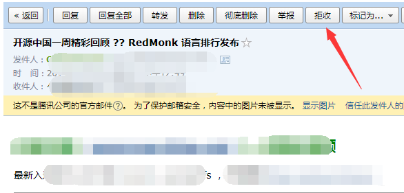 5、同时大家也可以点击到邮件内部,点击上面的拒收按钮,下次这个邮件地址就不会发信给你了。