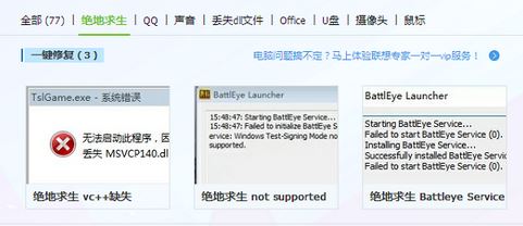 解决方案:使用电脑管家的电脑诊所里面,绝地求生VC++修复点进行修复。