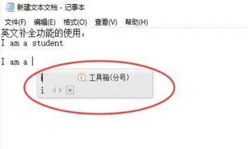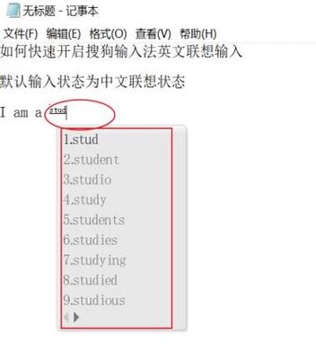 3、英文状态切换完成,这时输入“I am a student”作为实例,你能看到student这个单词没有完全输完的情况下,会有单词的联想下拉菜单供你选择,省去了全部输入的问题,实现了联想输入;