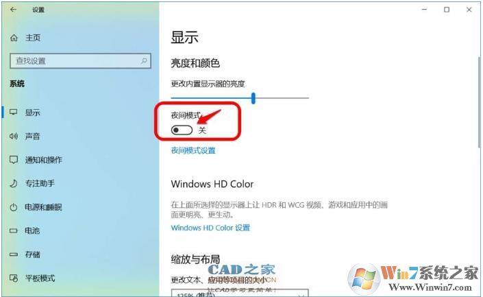 3、在显示设置窗口中,我们看到:夜间模式的【开关】处于【关】的位置,如果是开的,你想关闭,那么点击一下变成关闭就关掉夜间模式了;