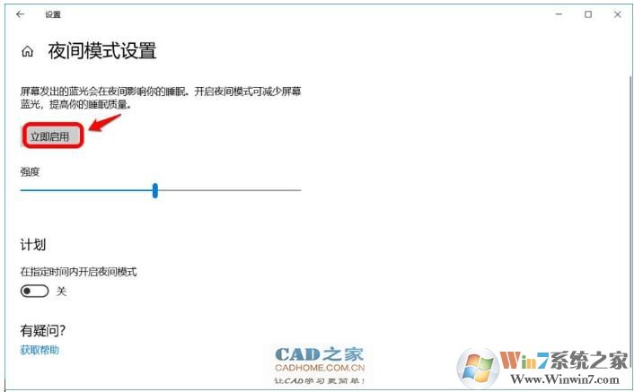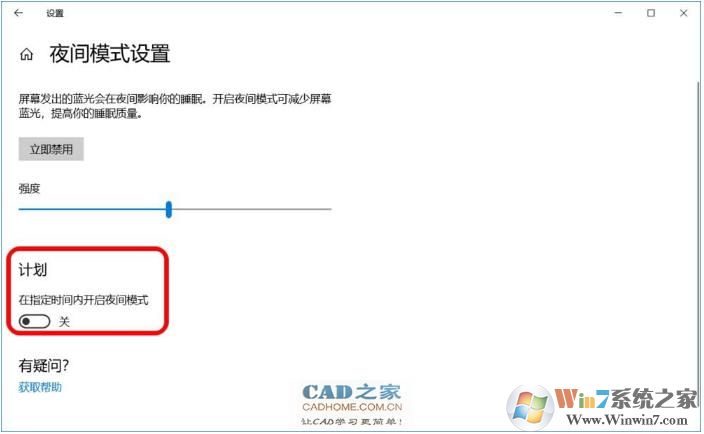 6、在 计划 在指定时间内开启夜间模式 的【开关】仍处于【关】的位置;