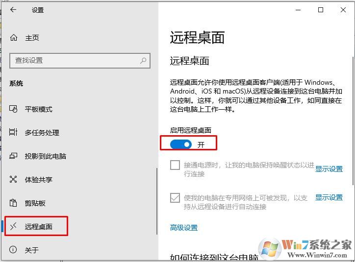3、在下面左边找到远程桌面,然后在右侧启用远程桌面为“开”;