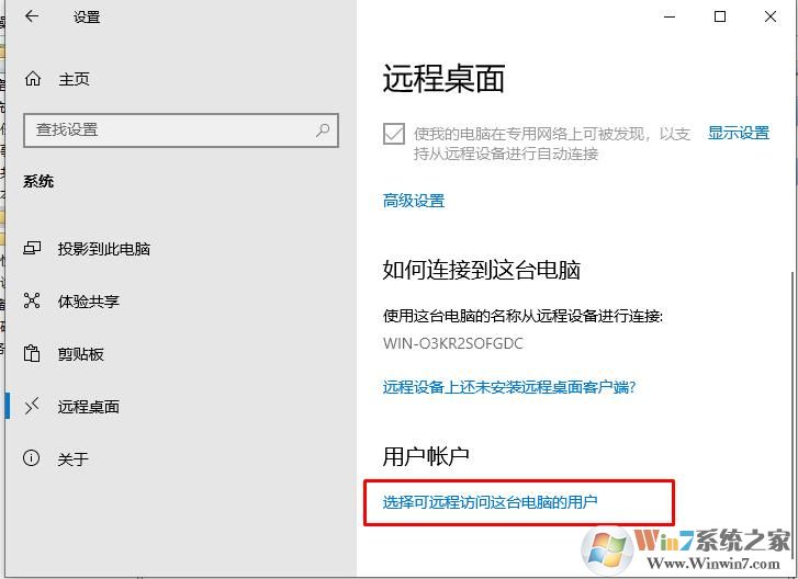 4、这时就启用了远程桌面,你还要分配一个可以远程桌面的账户,点击【选择可远程访问这台电脑的用户】;