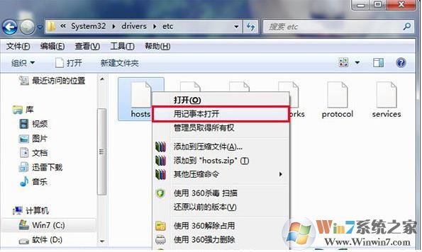 3、找到hosts文件并右击。待看到弹出的选项选中“用记事本打开”。