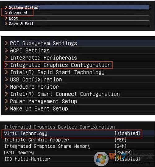 进入BIOS页面后,找到“SETTINGS”——“Advanced”——“Integrated Graphics Configuration”——“Virtu Technology”选项,把“Disabled”修改为“Enabled”;