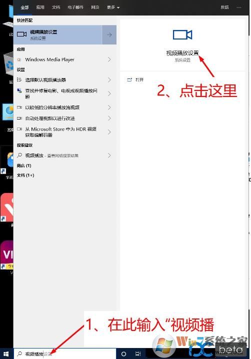 1、在状态栏中的搜索栏中输入“视频播放”,如下图