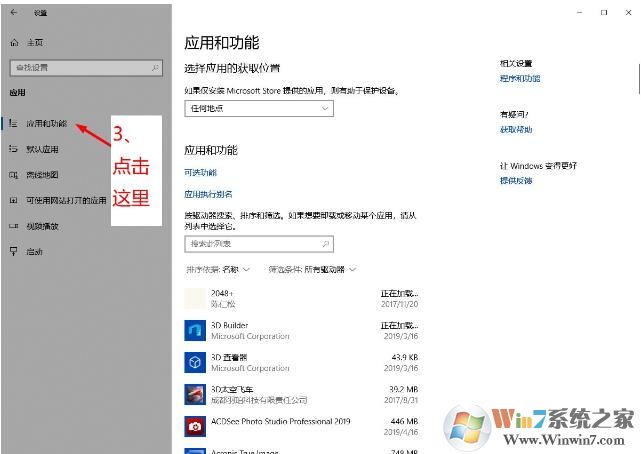 点击左侧的“应用和功能”,即可打开“应用和功能”。