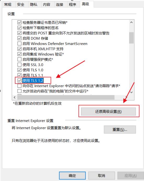 3、然后去高级那里打开 勾上"使用TLS 1.2"选项,或者还原高级设置。